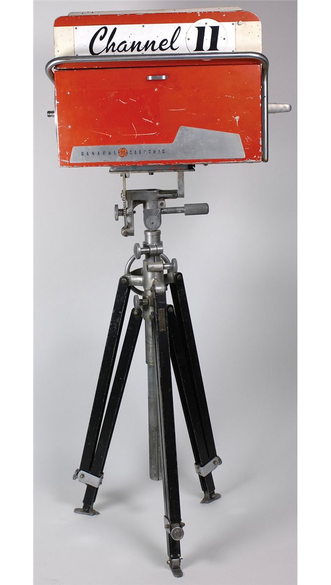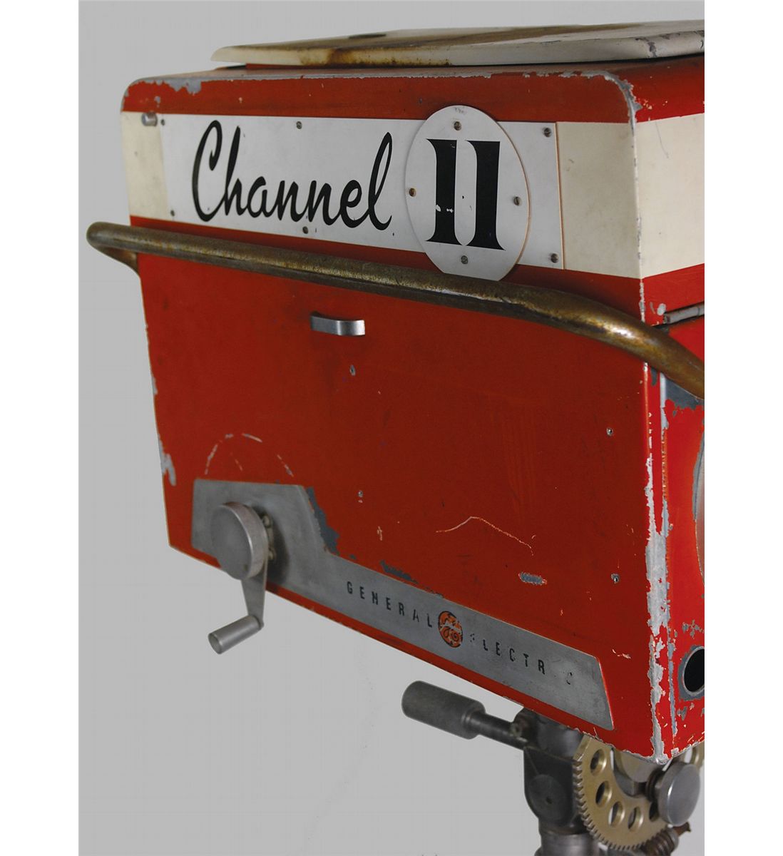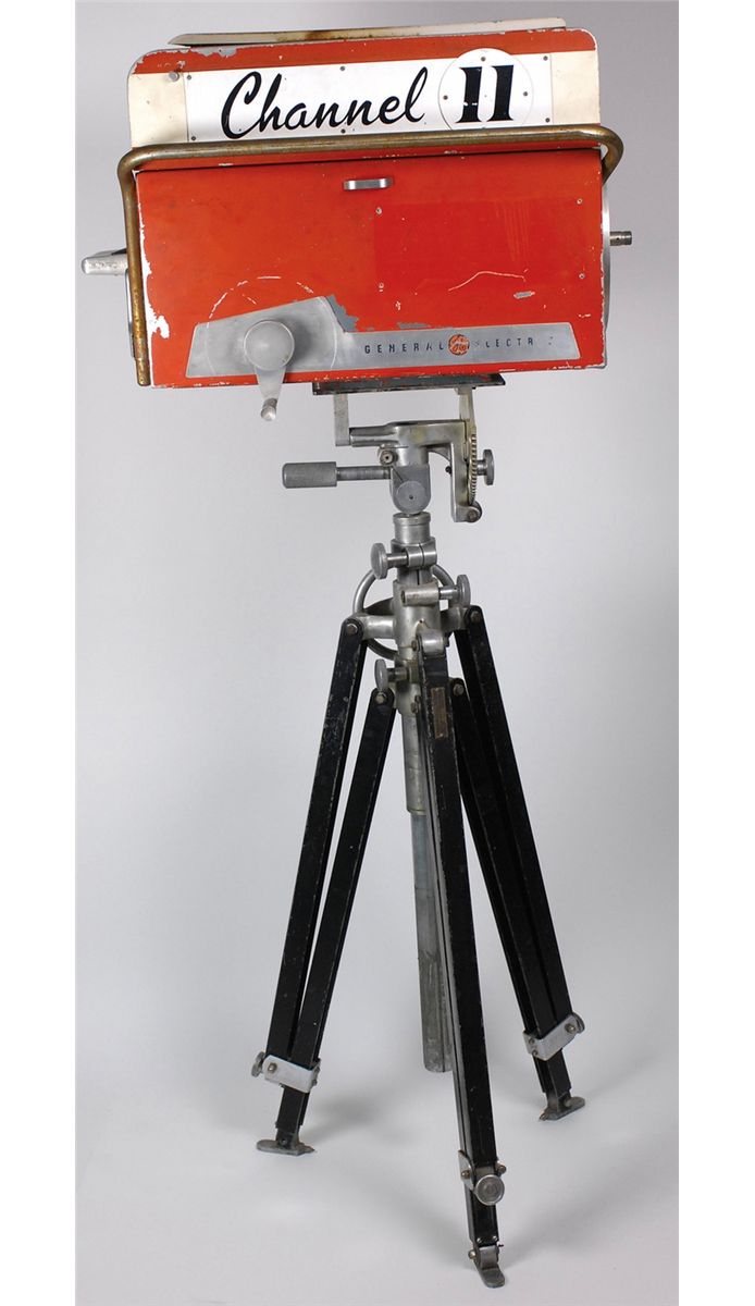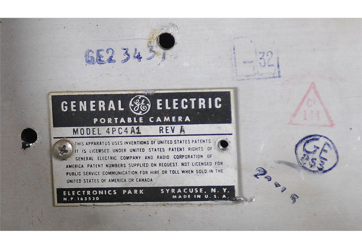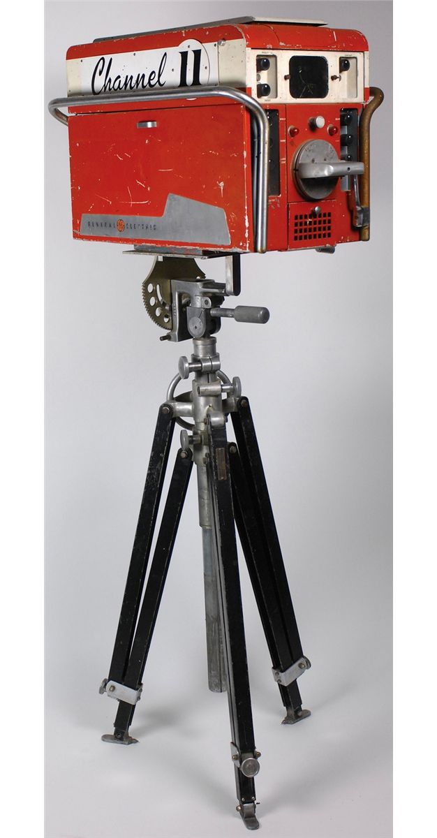 Historic early 1960s General Electric video broadcast camera, originally owned by KTVT Channel 11 Television news in Fort Worth, Texas, which recorded Jack Ruby shooting Lee Harvey Oswald in the basement of the Dallas Police Station on November 24, 1963. This General Electric Portable Camera measures 12.5 x 22 x 16, 63? high on the tripod. A metal data plate is screwed to the inside and is visible when the side door is opened. Plate reads, “General Electric Portable Camera / Model 4PC4A1 Rev A.” Directly above the plate is a stamped number, which reads, “GE23437.”The camera is complete with original tripod and head mount. The exterior retains most of its original paint scheme and Channel 11 logos. The inside is empty, with all parts having been removed, and no lens accompanies the camera, as those were saved by the studios after the cameras were taken out of service. In very good condition, with expected age wear and areas of light to moderate rusting.