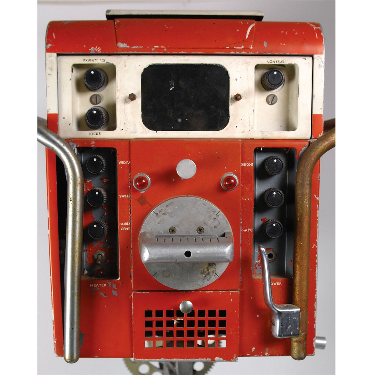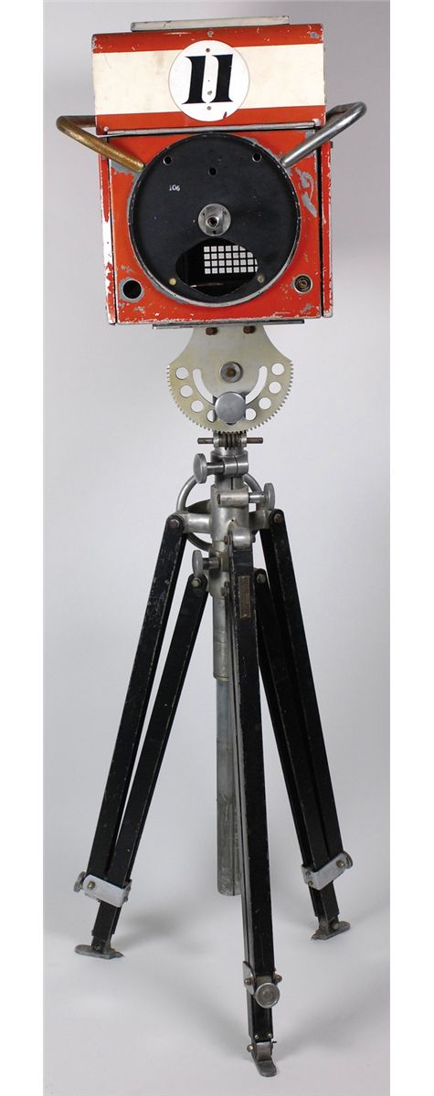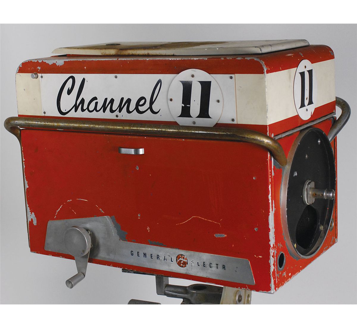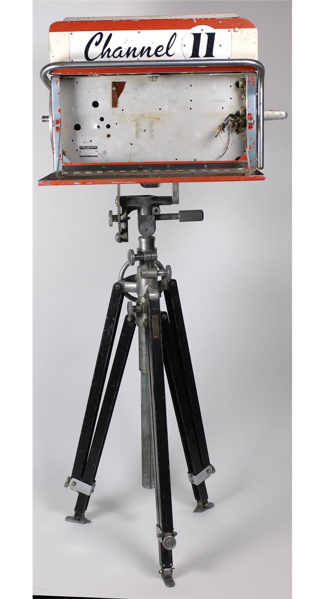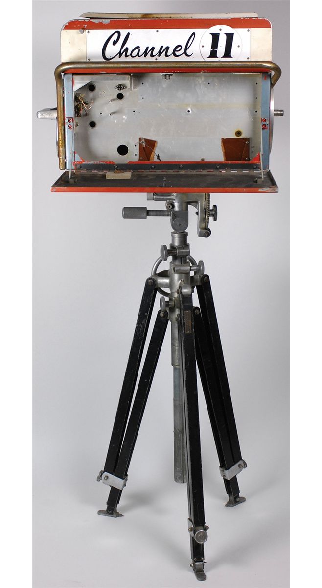 Historic early 1960s General Electric video broadcast camera, originally owned by KTVT Channel 11 Television news in Fort Worth, Texas, which recorded Jack Ruby shooting Lee Harvey Oswald in the basement of the Dallas Police Station on November 24, 1963. This General Electric Portable Camera measures 12.5 x 22 x 16, 63? high on the tripod. A metal data plate is screwed to the inside and is visible when the side door is opened. Plate reads, “General Electric Portable Camera / Model 4PC4A1 Rev A.” Directly above the plate is a stamped number, which reads, “GE23437.”The camera is complete with original tripod and head mount. The exterior retains most of its original paint scheme and Channel 11 logos. The inside is empty, with all parts having been removed, and no lens accompanies the camera, as those were saved by the studios after the cameras were taken out of service. In very good condition, with expected age wear and areas of light to moderate rusting.