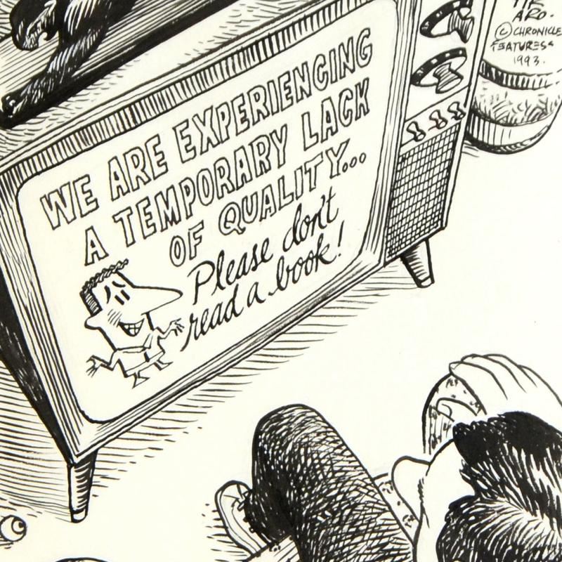 Enter a surreal and satirical world of twisted imagination and award winning creativity. "TV - Don't Read a Book" is an original pen & ink drawing on paper by Dan Piraro, creator of the critically acclaimed and award winning comic strip, Bizarro! This pie