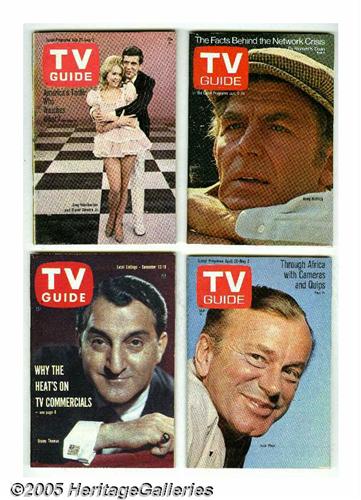 <B>TV Guide Group (Various, 1952-78) Condition: Average VF.</B></I> For many years, the most popular magazine in America was <B>TV Guide</B></I>. This lot is a nostalgic treasure trove of television history, consisting of 79 issues of that beloved magazine. Most copies are in excellent condition, and while there are no copies of well-known collector's items like the Superman or Elvis covers, there's plenty of great stuff here for fans of the ol' Boob Tube. In addition, there's another 17 copies of publications like <B>TV Dial</B></I> from the early 1950s. Featured on the covers are stars like Jackie Gleason, Red Skelton, Jimmy Stewart, Bob Hope, Doris Day, and many others. Several issues are Christmas specials; most copies originated from Pittsburgh or Cincinnati. Find out what was on! <I>From the collection of Chris Bell.</B></I>