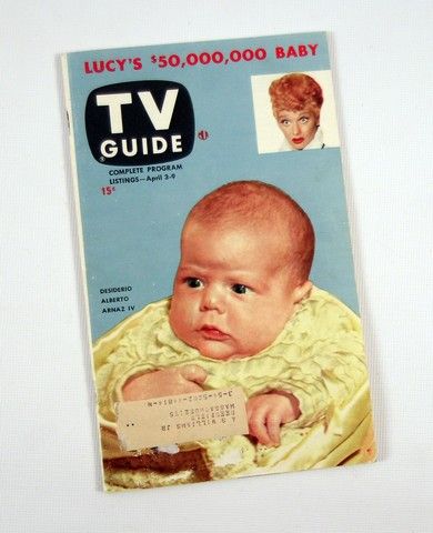 TV Guide Lucy's Baby First Issue - The three most valuable TV Guide issues of all time are George Reeves as Superman, Elvis Presley on Ed Sullivan, and the most rare and sought after, the first National TV Guide issue TV Guide #1 April 3-9 1953. On the cover is "Desiderio Alberto Arnaz IV", or Desi, Jr., Lucille Ball's baby, which became a national obsession, since she was the first woman on TV to actually become pregnant (though you couldn't say that word!) on her mega-hit classic series, "I Love Lucy". This is that famous "Lucy's $50,000,000 Baby" first issue. It is in Excellent condition, and includes the original postal mailing label.