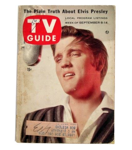 TV Guide With Elvis Presley On The Cover September 1956 - Few perhaps remember "The Ed Sullivan Show", however he was the star maker for over 30 years with his Variety show. No one can forget his two most rising stars that changed the world, Elvis' first performance in 1956, and of course the Beatles in 1964. This is an extremely rare original TV Guide with the new music sensation Elvis Presley on the cover promoting his Sunday, September 9th, 1956 appearance on Sullivan's show. This is the September 8-14, 1956 issue with the infamous article "The Plain Truth About Elvis Presley". It is in good condition, and includes an original Postal mailing label. There is a catalogue number marking in ink over the TV Guide logo.