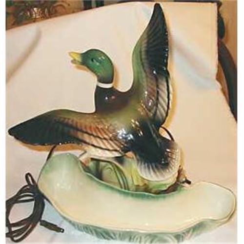 Sure to be a hit for the sportsman is this 50's TV lamp with a duck in flight. It has a partial sticker underneath the bird that says Lane California. It is 14" in diameter and 13" tall and has a planter in the front. Very good condition.