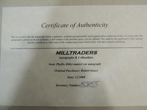 TV STAR PHOTO & AUTOGRAPH PHYLLIS DILLER COA. INCLUDES COA FROM MILLTRADERS AUTOGRAPHS & COLLECTIBLES. AS SHOWN. VIEW PICTURE FOR DETAIL. PLEASE BE ADVISED, AND INFORMED REGARDING SIGNATURES OR AUTOGRAPHS THAT WE SELL AT AUCTION: WE ARE NOT AUTHENTICATORS, AND WE DO NOT AUTHENTICATE, OR VALIDATE ANY AUTOGRAPHS OR SIGNATURES THAT WE OFFER AT AUCTION. SOME AUTOGRAPHS OR SIGNATURES MAY COME WITH AN AUTHENTICATION FROM ANY ONE OF LITERALLY HUNDREDS OF AUTHENTICATORS ACROSS THE COUNTRY, AND AROUND THE WORLD. WE DO NOT ENDORSE ANY AUTHENTICATOR, NOR DO WE GUARANTEE THAT ANY AUTOGRAPH OR SIGNATURE IS AUTHENTIC, OR THAT IT WILL PASS AUTHENTICATION BY ANY AUTHENTICATOR. ALL AUTOGRAPHS OR SIGNATURES ARE SOLD