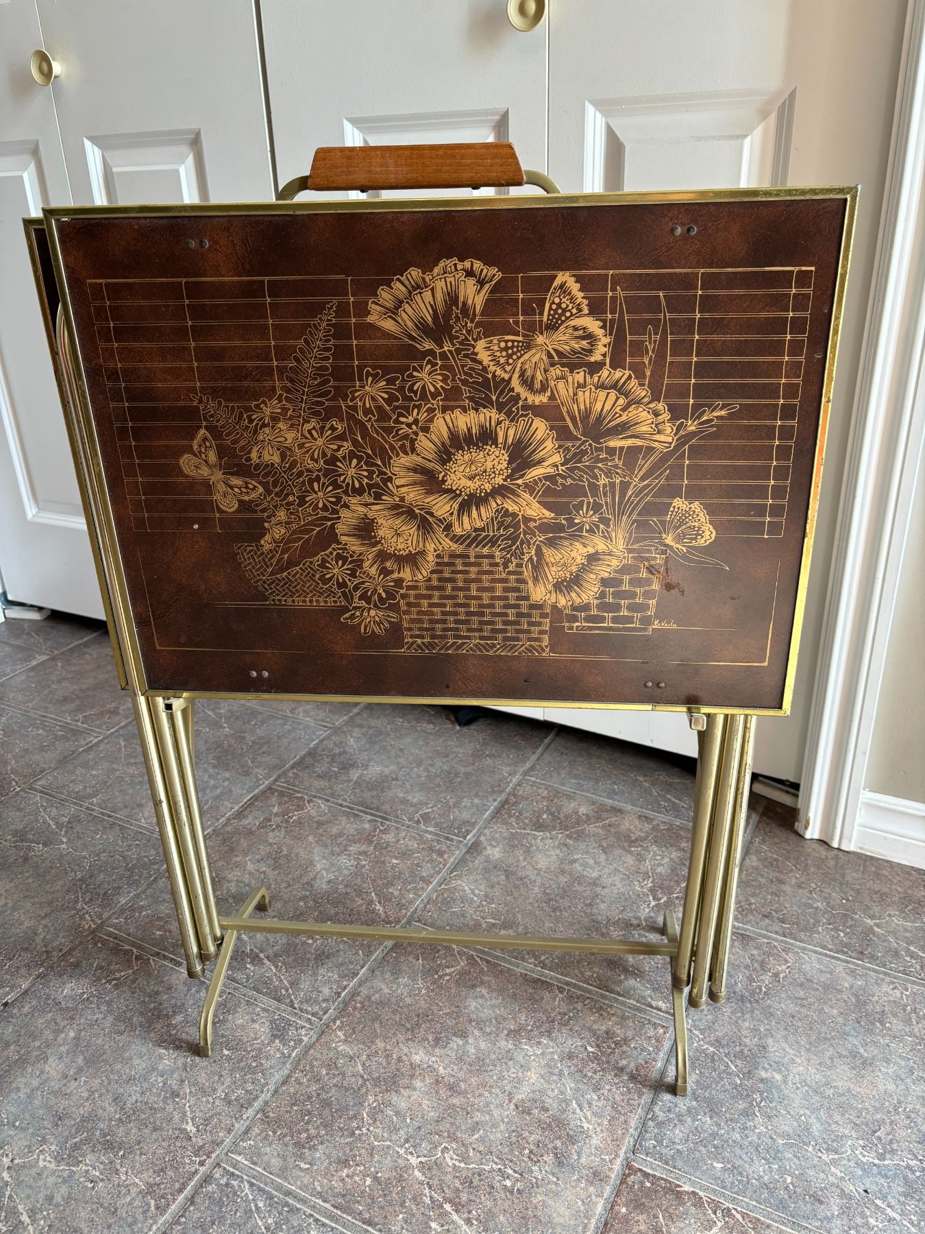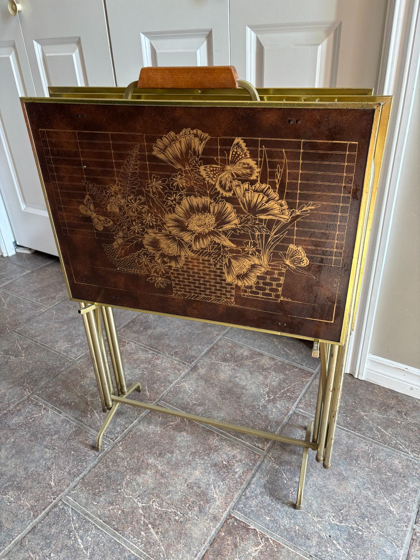 Brown and gold trim, handy, foldable and stowable 31” high x 3.5” , 22” wide