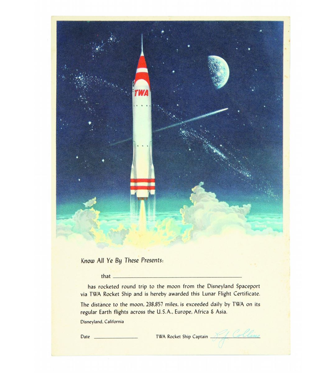 (Disneyland, 1955) A rare giveaway from the TWA Rocket to the Moon attraction. This certificate would certify that the individual has, “rocketed round trip to the moon from the Disneyland Spaceport via TWA Rocket Ship”. An enjoyable early Disneyland artifact. Especially rare in that it was never filled out by the park-goer! Measures 7”x5”. In very good condition with minimal wear and light edge discoloration.