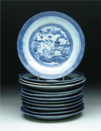 TWELVE BLUE AND WHITE CANTON PLATES. Assembled set. SIZE: 7in. to 7-3/4in.. CONDITION: Very good. 9-26096