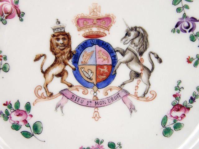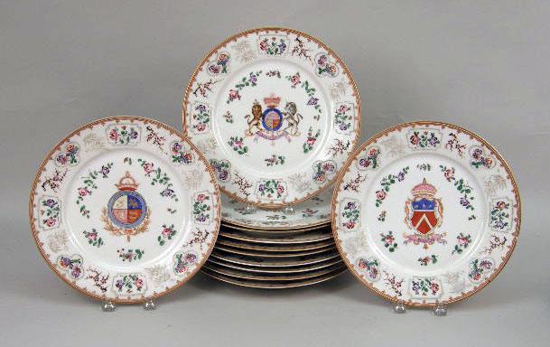 TWELVE CHINESE-STYLE POLYCHROME-DECORATED ARMORIAL PORCELAIN DINNER PLATES, PROBABLY FRENCH