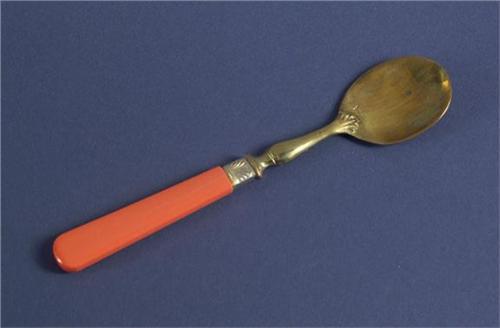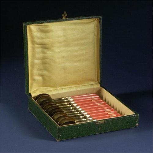 FLATWARE: A set of 12 Guelon France brass ice cream spoons with orange bakelite handles and European sterling silver bands, original green paper covered box with clasp. Spoons are 6 ¬'' long and the box is 7 3/8'' W x 6 _'' D x 1 _''D, circa 1930- 1940's. Note: Spoons show some rub marks from use and bakelite shows crazing/cracks on the handles, none is separated from spoon hilts, box surface is worn in places.