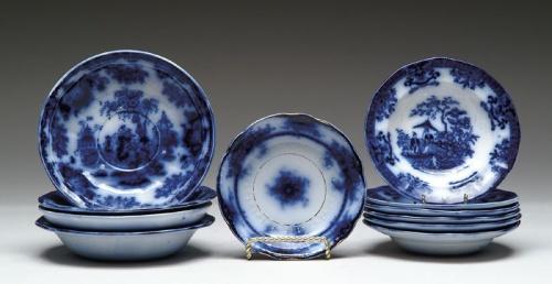 TWELVE MISCELLANEOUS DISHES/SAUCERS. Lot includes: Four 5-1/4in. dishes in the ""Scinde"" pattern; Two 5in. dishes in the ""Amoy"" pattern; Two 5in. dishes in the ""Kelvin"" pattern; Two 6in. dishes in the ""Kyver"" pattern. 5-3/4in. saucer in the ""Manila"" pattern and a 5-3/4in. saucer in the ""Scinde"" pattern (with hairline). CONDITION: As noted above, generally very good. 9-25833