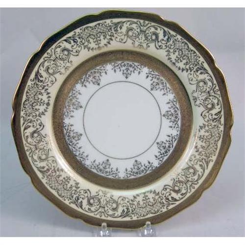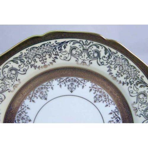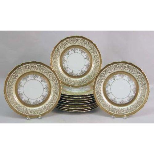 TWELVE PARCEL-GILT DECORATED PORCELAIN SHAPED SERVICE PLATES<BR><BR>Bohemia, made in Czechoslovakia, retailed by R.H. Macy & Co., chips and wear, 10 3/4"dia.