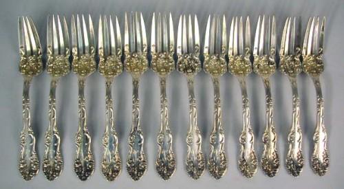 TWELVE TOWLE STERLING SILVER "OLD ENGLISH" PATTERN FISH FORKS; With vermeil wash, apx. 10 T.O.