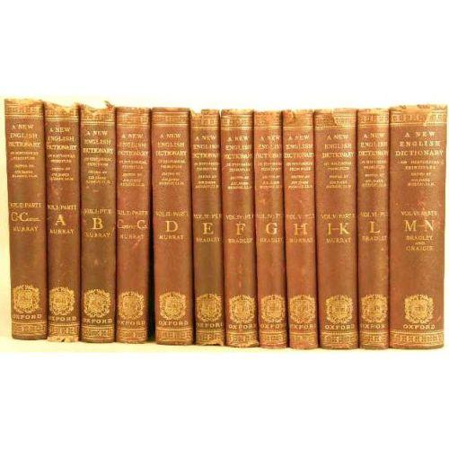 TWELVE VOLUMES OF "A NEW ENGLISH DICTIONARY ON HISTORICAL PRINCIPALS<BR><BR>Founded Mainly on the Materials Collected by the Philological Society", edited by James A. H. Murray, Oxford, Clarendon Press, 1888. Comprising Volumes A - N. With a dedication to Her Majesty Queen Victoria.