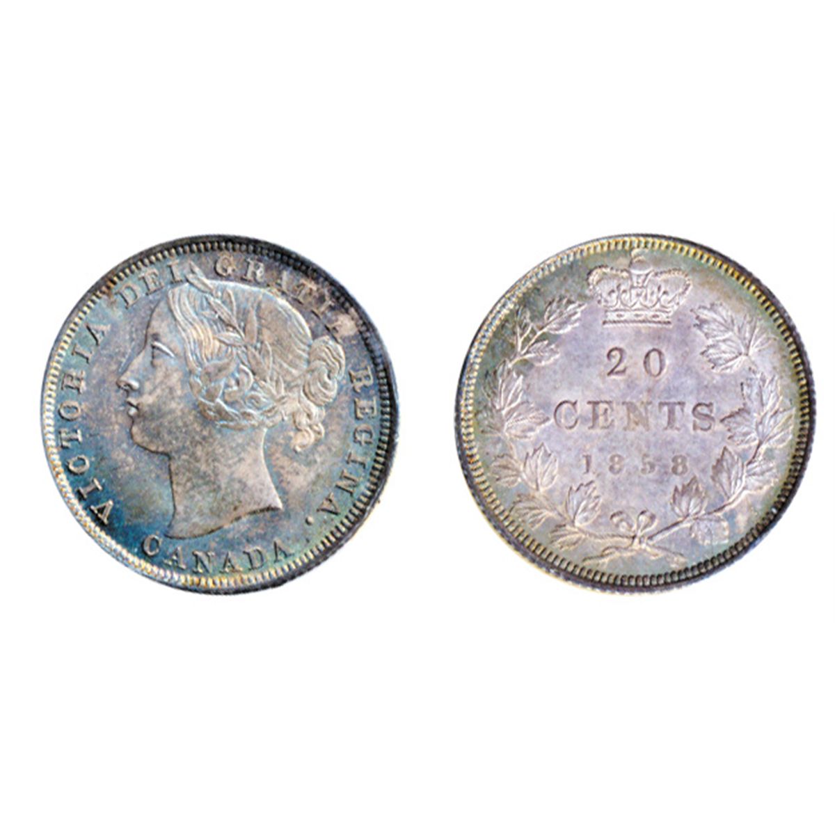 TWENTY CENTS. 1858. ICCS Mint State-67. The solo ‘Finest’ graded example. Accompanied by an ICCS Numismatic Condition and Rarity Appraisal Certificate. Described by ICCS as: Overall Eye Appeal-Great and Superb. Quality of Luster-Superb. Quality of Surfaces-Superb and Near Flawless. Quality of obverse strike. Nearly Full. “The obverse is particularly special”.