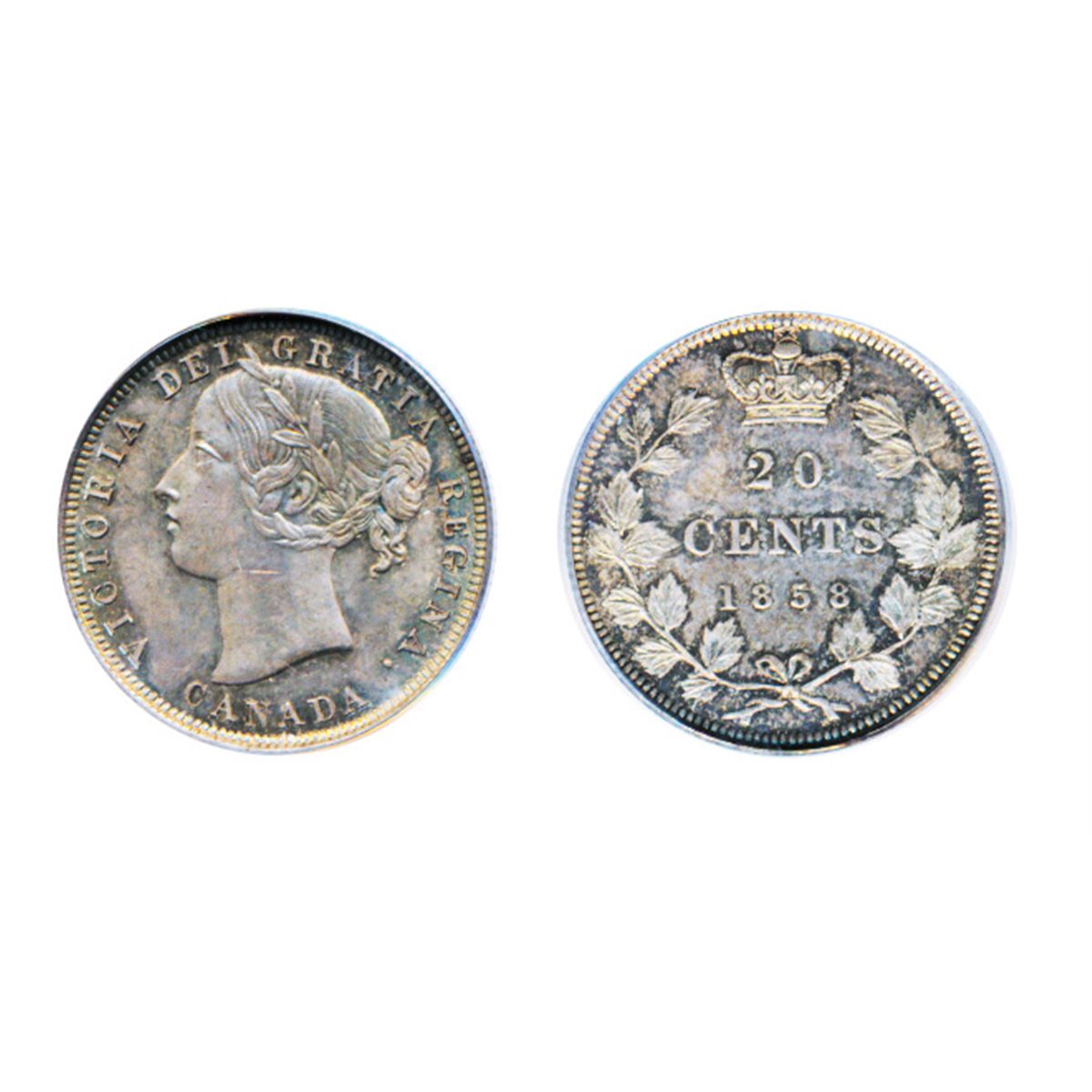 TWENTY CENTS. 1858. PCGS graded Mint State-64. Fully struck. Light premium quality toning on the obverse, with slightly deeper light violet toning on the reverse. Excellent ‘eye appeal’.