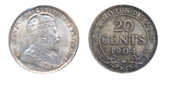 TWENTY CENTS. 1904-H. ICCS Mint State-64. The solo second ‘Finest’ graded example by ICCS. Excellent strike and fields. Great ‘eye appeal’. Outstanding luster, with a trace of blue luster on the obverse lettering and a lightly toned reverse. Ex. MOORE’S, ca. 1982.