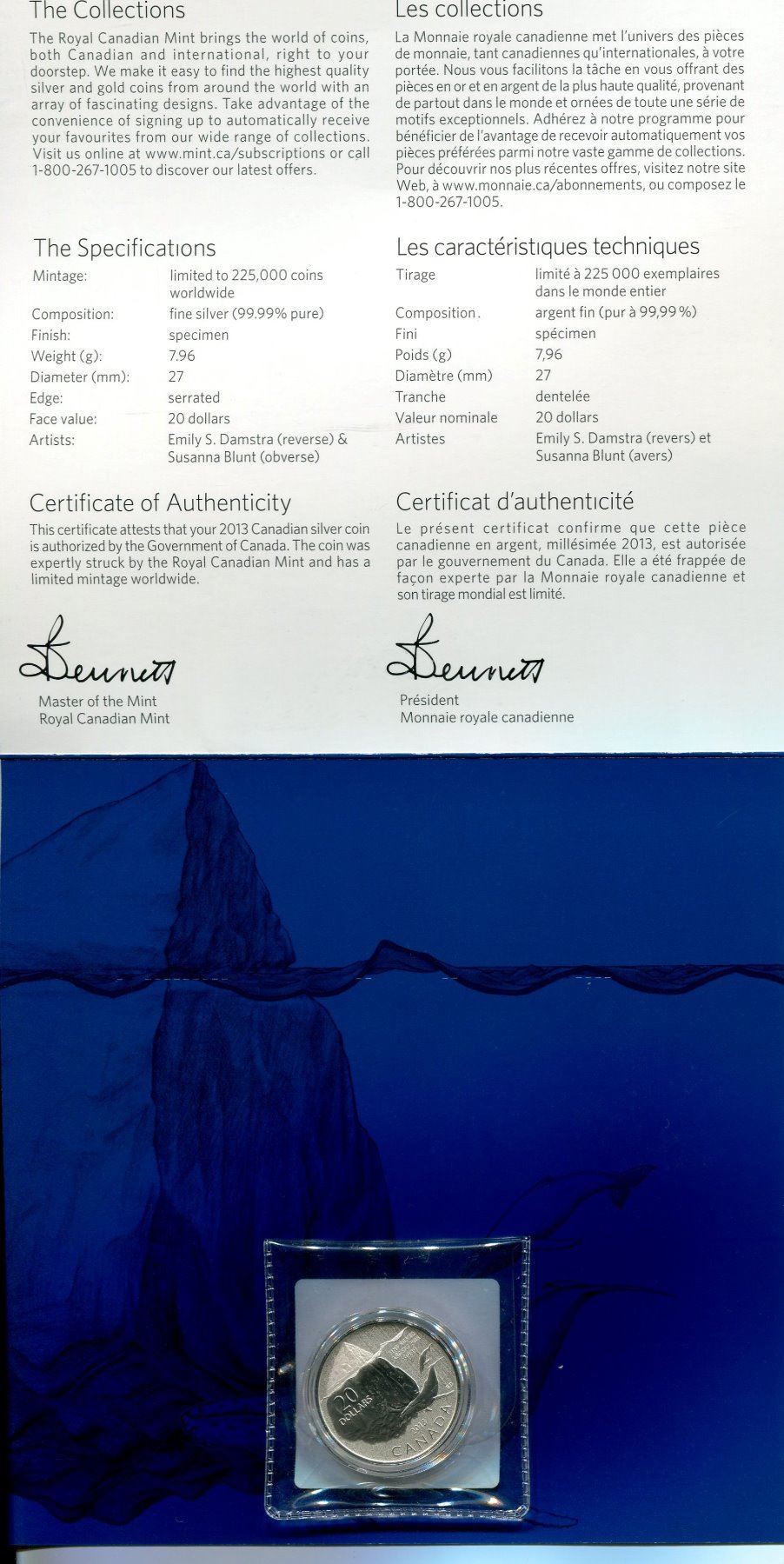 TWENTY DOLLAR SILVER COIN (2013) *CANADA* (SAVE THE WHALES) *CANADA MINT COIN*