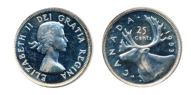 TWENTY-FIVE CENTS. 1953 SS. Proof-Like with Heavy Cameo contrast. Some surface marks.