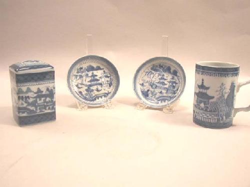 TWENTY-ONE CHINESE EXPORT SMALL PLATES AND SAUCERS; Canton pattern, together with an egg cup, sauce dish, and five pieces by Mattahedeh (20 pieces) (losses)