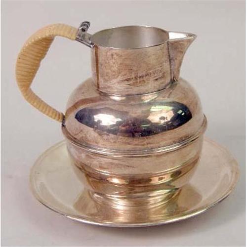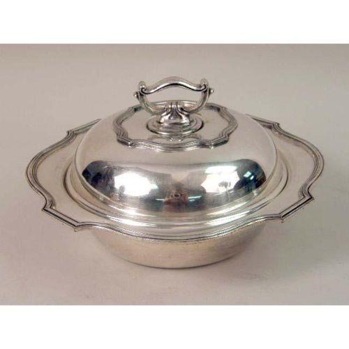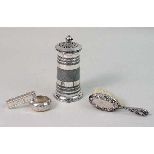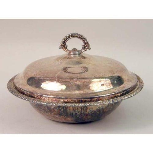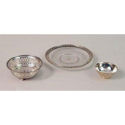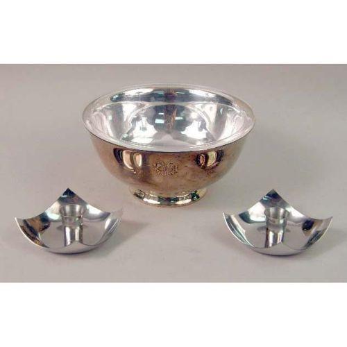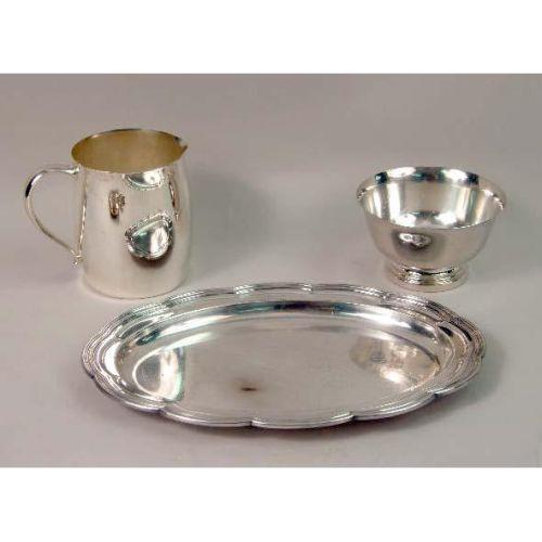 TWENTY-ONE SILVER PLATED SERVING ITEMS<BR><BR>Including, a Tiffany and Co. tray, a Gorham sterling silver bowl, a baby brush, and two water pitchers, losses