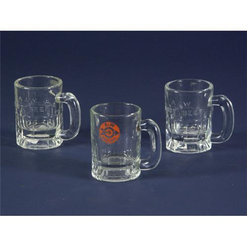 Two vintage A&W root beer mugs with a red, black, and brown bull's eye logo: one in a 6'' size and one in a 4.5'' size.