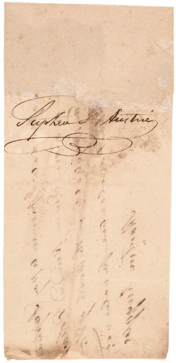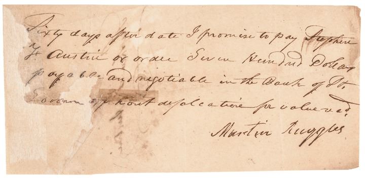 Manuscript Autograph Document , “Stephen F. Austin” within the text, and once again on the verso, not dated, 1 page, 7.5” x 3.5”, Fine. Being a promissory note to Martin Ruggles of Caledonia, Missouri for $700. Signed, "Martin Ruggles," below Austin's text. Light scattered tone, small stains and smudges, loss at bottom right affects several words of text and has been repaired infilled with paper at the left side, else very good condition. This Document reads, in full: “Sixty days after date I promise to pay Stephen F. Austin or order Seven Hundred Dollars payable and negotiable in the Bank of St. Lou(is a)mount defalcation for value recd.” A rare TWICE Signed Document by Texas Founding Father Stephen F. Austin.