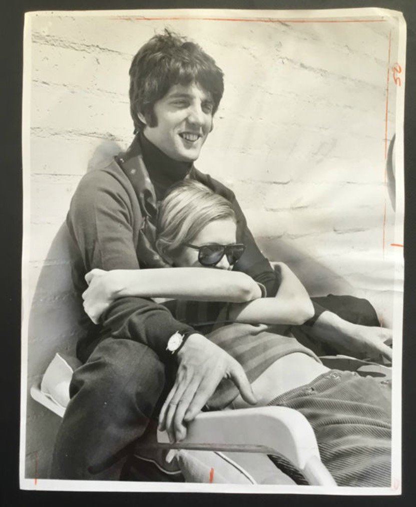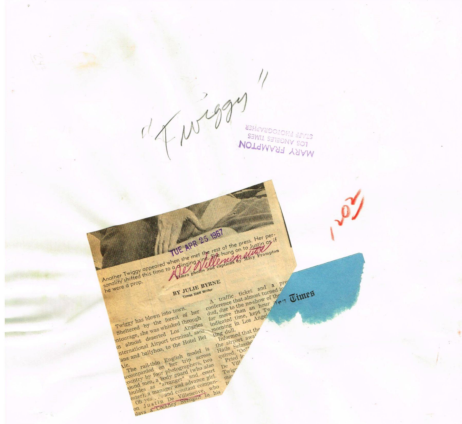 A photo of British model Twiggy and boyfriend and ex manager Justin De Vileneuve by photographer Mary Frampton. Stamped with Mary Frampton's Los Angeles Times stamp. Size: 14x11 inches. Condition: Fair with a lot of warping throughout.