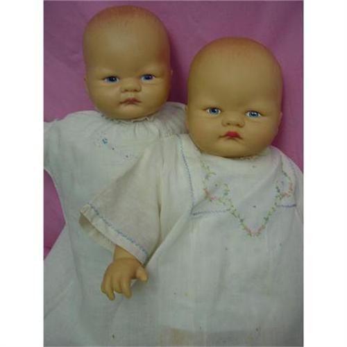 Twin Babydolls by Playmate in Vintage Gowns. Two babies measuring 18inches long with cloth bodies and vinyl head, arms, and legs. Their faces have handpainted features with rosy complexions, blue eyes, and sweet red lips. They have newborn features. They are in very good condition and wear vintage baby gowns with delicate embroidery. One of the gowns has some yellowing age spots. Cute set to add to your doll collection! (Item #80000211)