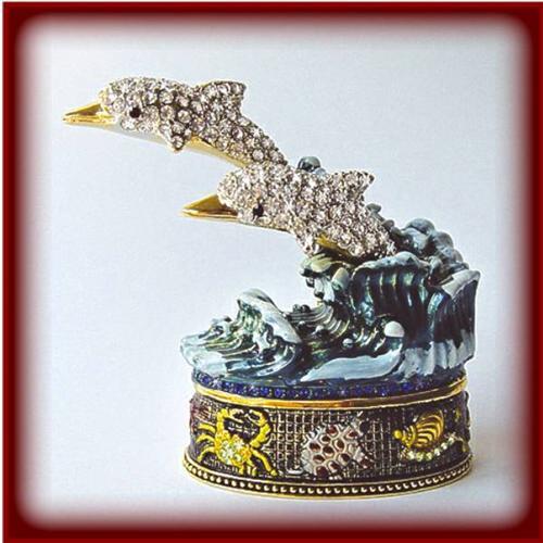 TWIN DOLPHINS 24K GOLD CRYSTAL JEWELRY BOX OCEAN BEACH