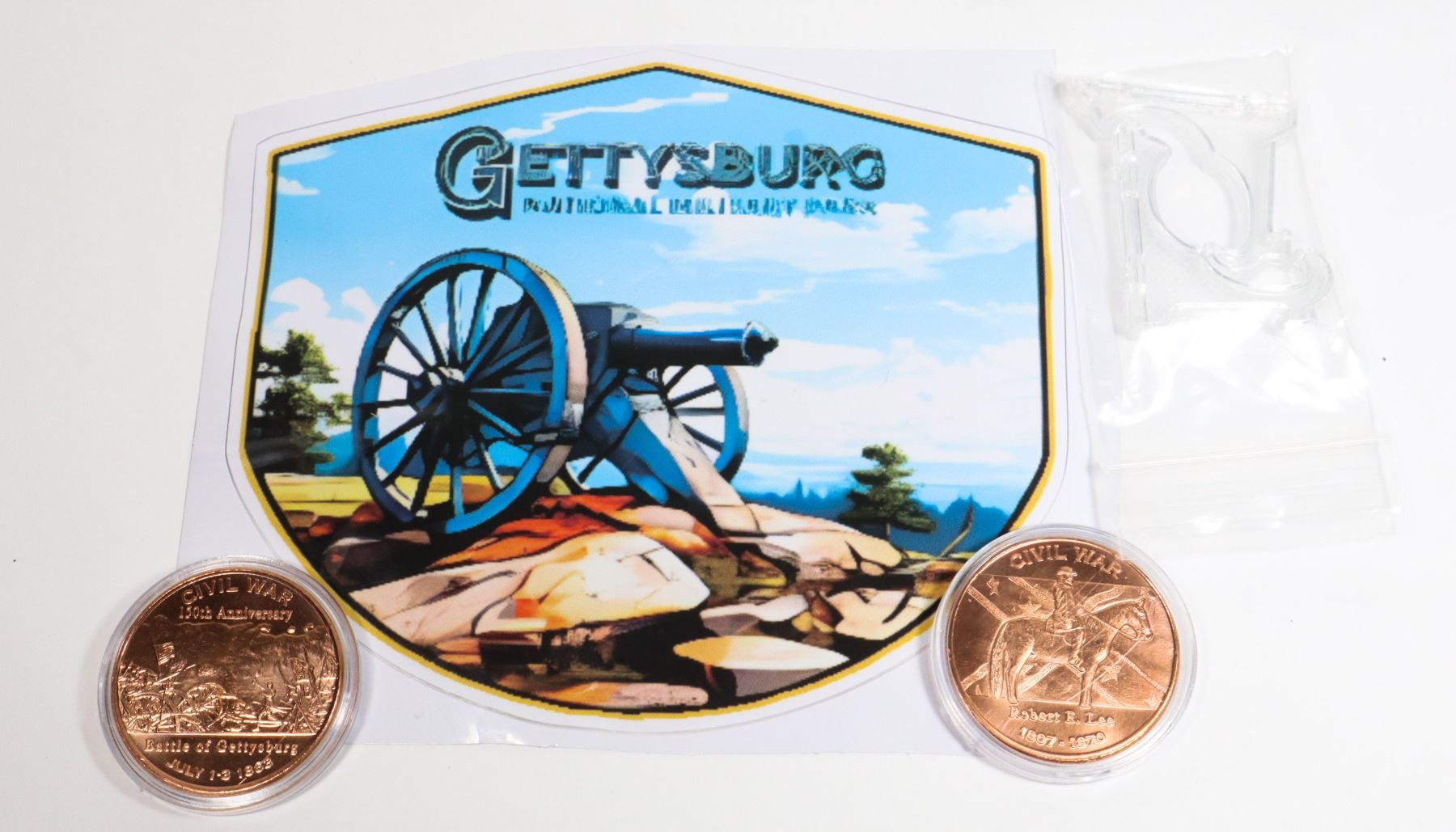 GENERAL ROBERT E. LEE AND GETTYSBURG. COMES WITH EASELS AND 6" X 5" GETTYSBURG BUMPER STICKER IN COIN SHIPPING GRADE ENVELOPE