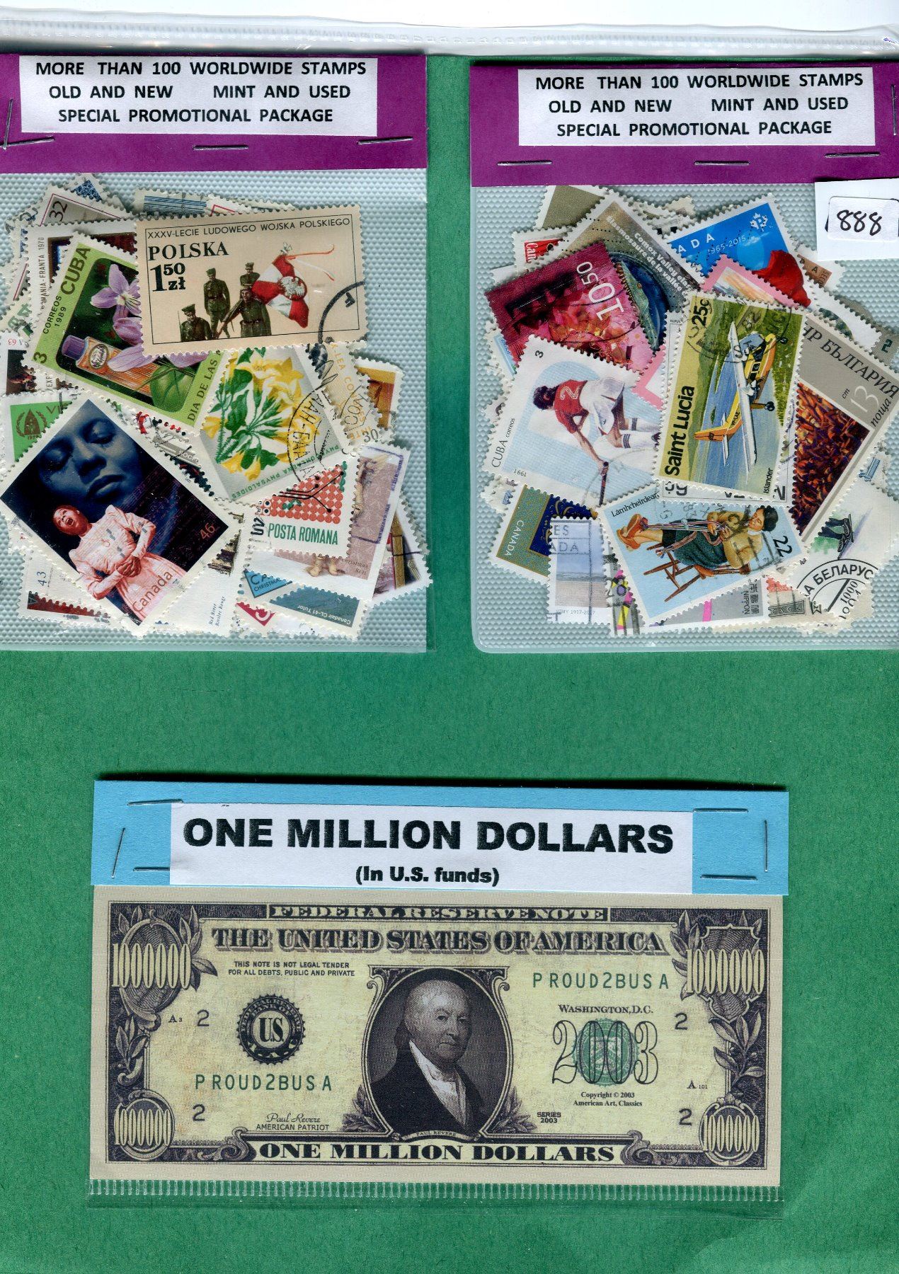 TWO 100 STAMP PACKAGES AND ONE MILLION DOLLAR PAUL REVERE NOTE