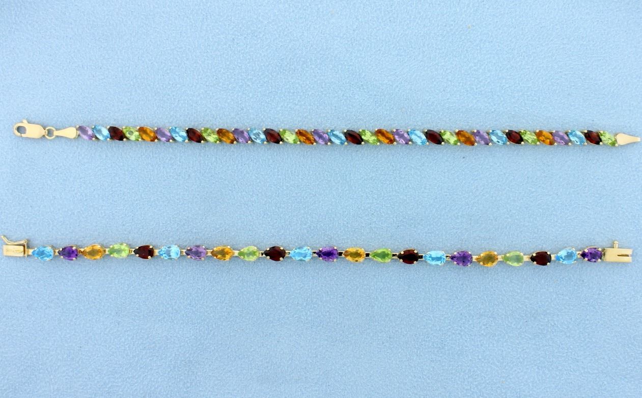 The 2 bracelets have citrine, amethyst, blue topaz, peridot and garnet. One bracelet has pear shape gems approx. 10 carats and 6.5" long. The second bracelet has 6mmx3mm marquise total of 10 carats! 12.6g