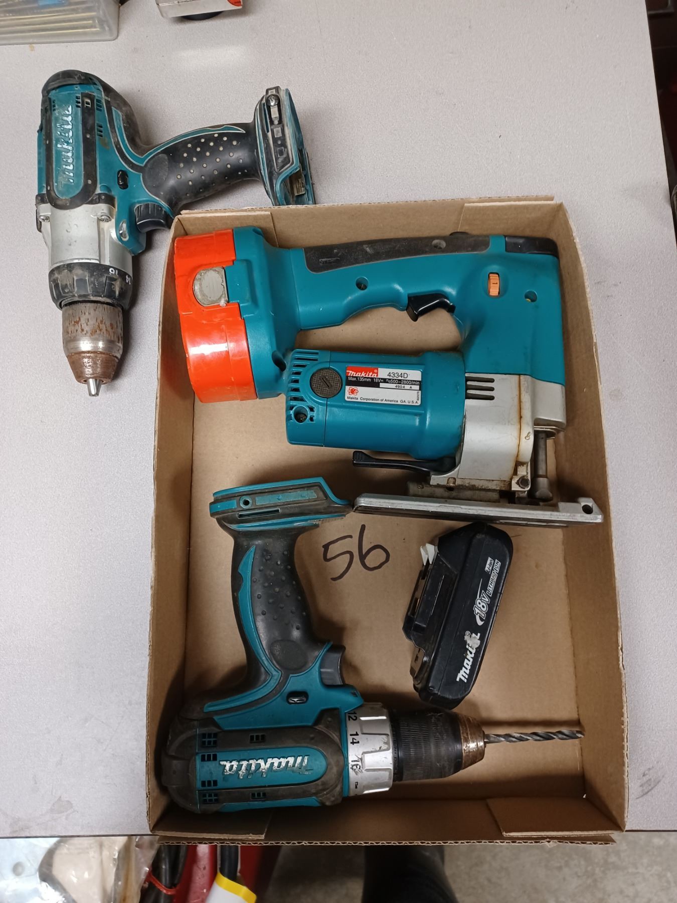 TWO 18V MAKITA CORDLESS DRILLS AND JIGSAW COMES WITH TWO BATTERIES AND CHARGER