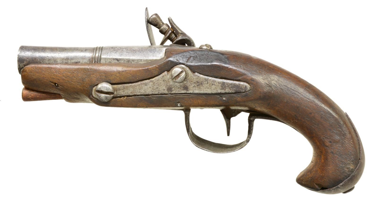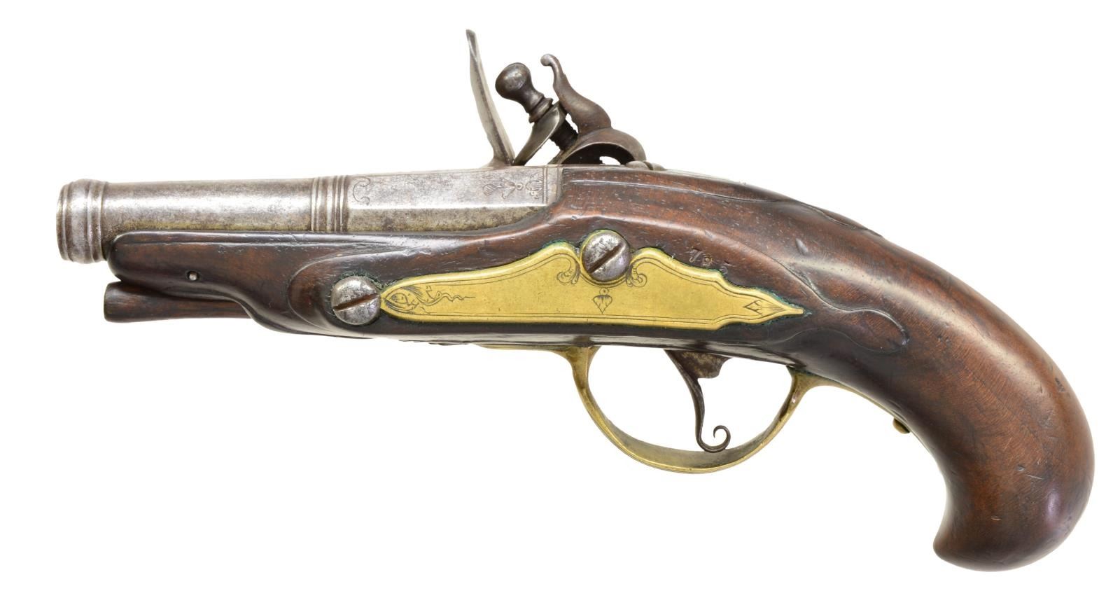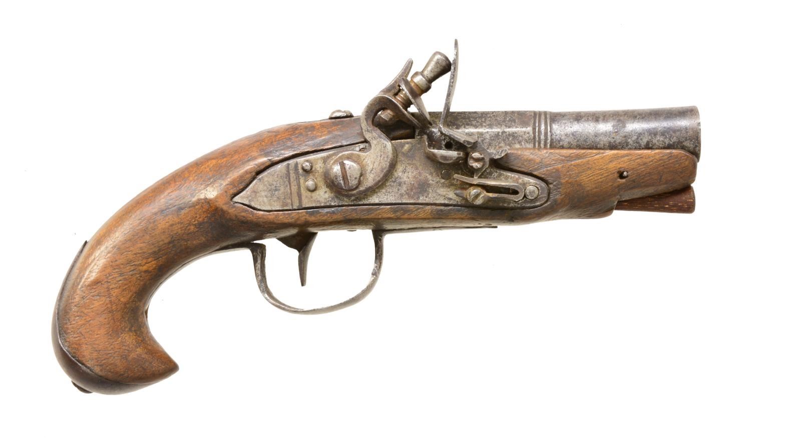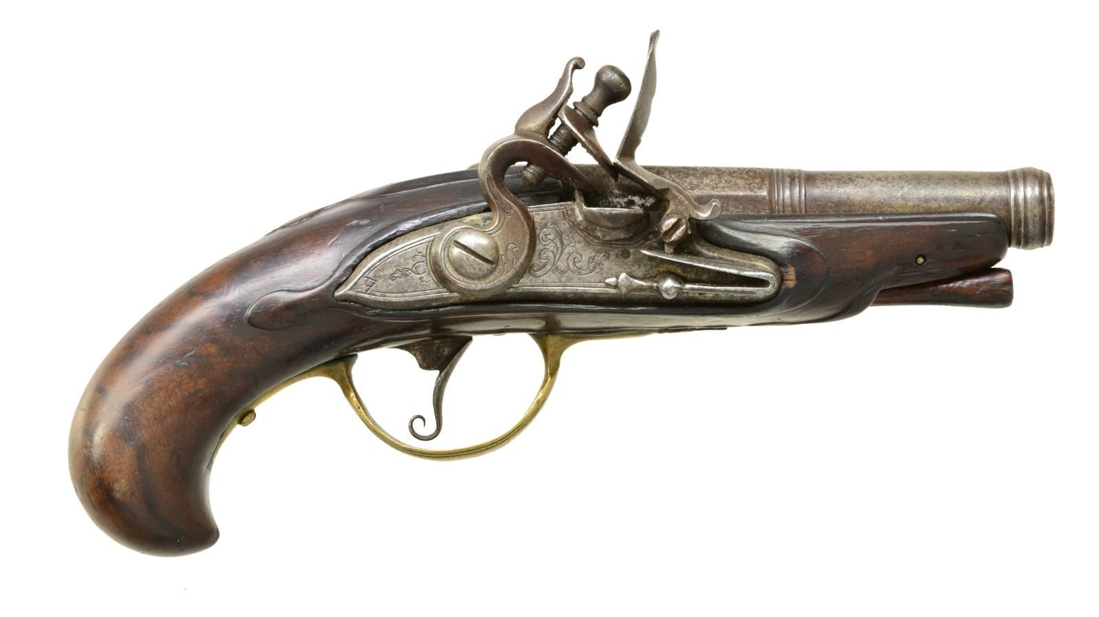 1) Cal. 40. NSN. 7" Overall. Bbl. 3 1/4" 2 stage oct. to rnd. tapered w/ ringed notched faced cannon muzzle, ringed transition. Engraved en suite iron lock, cock, breech, brass trigger guard & sideplate. Well fit walnut stock w/ moldings around lock, rear of bbl. & sideplate. An elegant little Revolutionary war era pistol CONDITION: very good overall, original & matching, sm. number “785” stamped in wood opposite lock above sideplate. Mechanically sound w/ clear smooth bore. 2) Cal. 42. NSN. 7" Overall. Bbl. 3" 2 stage oct. to rnd. tapered w/ ringed transition. Simplistic unengraved iron mts. & plain rustic stock. Diminutive unsupported flat serpentine cock. CONDITION: very good overall, metal has a mottled gray patina, stock is sound, well fit w/ hand worn patina still showing areas of raised grain. Mechanically sound w/ smooth clear bore. PROVENANCE: From the Collection of John "Tim" Breth Jr. (01-17785 & 01-17786/JS). BOTH ANTIQUE. $1,200-1,500.