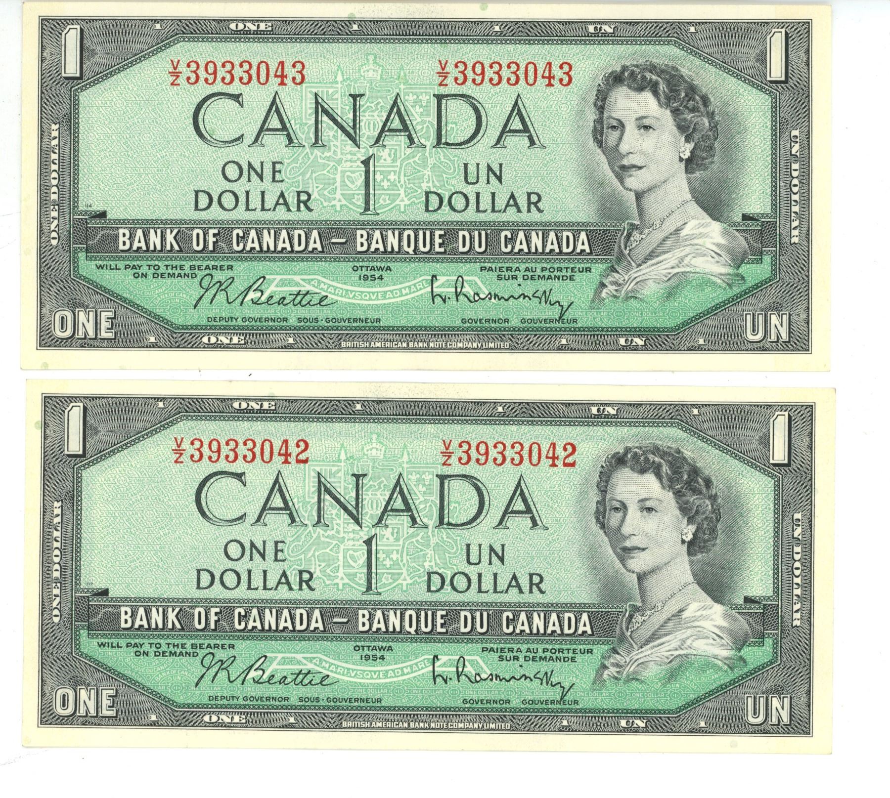TWO 1954 Consecutive $1.00 Notes #VZ3933042-43