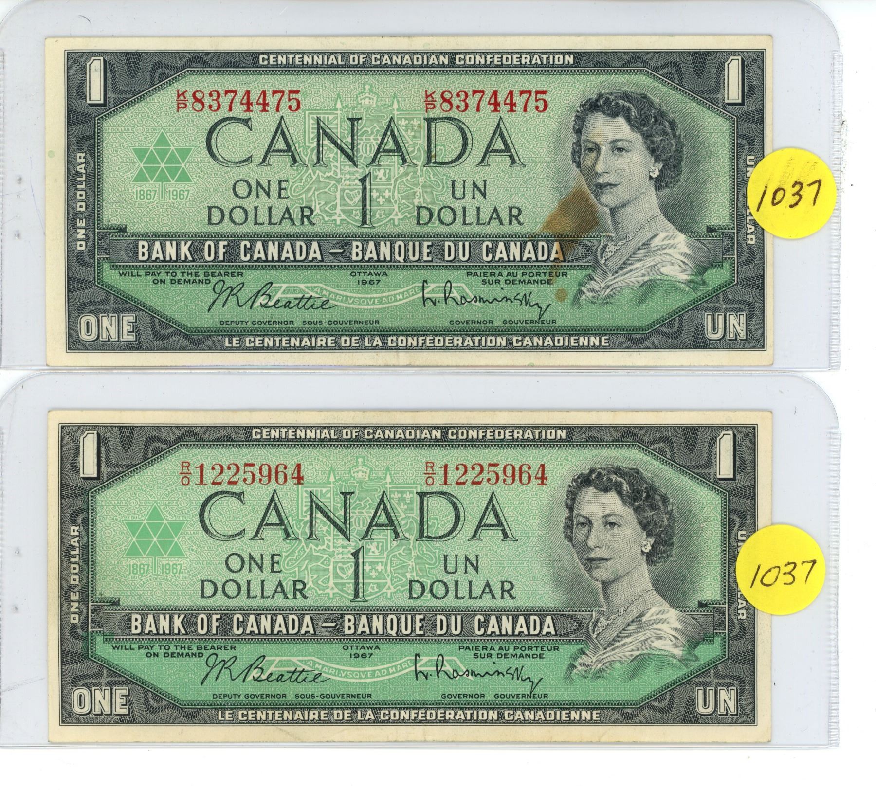 TWO - 1967 Centennial $1.00 Notes