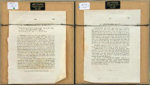 The first "Sibirian (sic) E. (Eared) Owl and Acadian Owl," the second "Ominous Owl", both verso with descriptive pages from the same antique ornithography book. Sight size each 7"h x 5 1/2"w