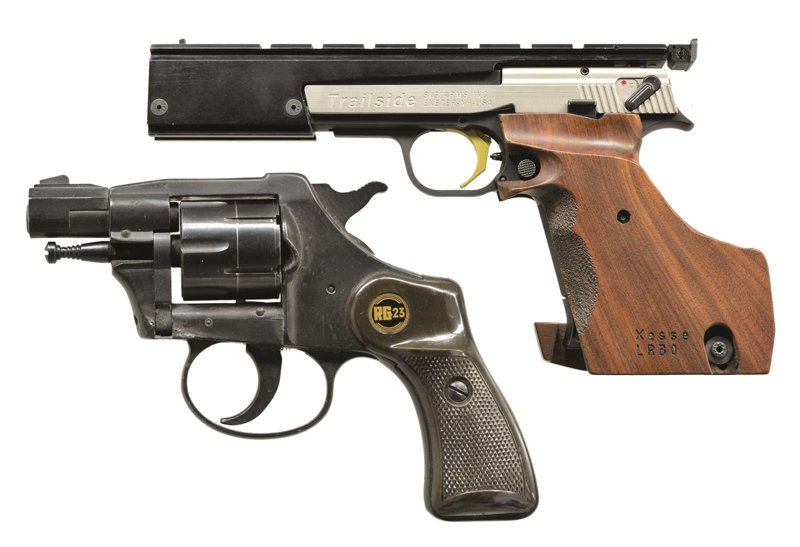 1) HAMMERLI / SIG ARMS TRAILSIDE SEMI-AUTO PISTOL. S# E0055320. Bbl. 6". Mfg. 2000-2005 as Competition variation by Hammerli for exclusive import by Sig Arms; both company writings on matte silver finished slide. Stippled wood target grip for right handed use marked "Xesse LRBO" plus adj. base. Gold adj. trigger w/ balance of finish being matte black. Multi slot Weaver style base incorporating flat faced front & adj. rear sights. Slide mounted lever safety & slide stop at top of grip. MAGS: 2 factory polymer 10 rd. CONDITION: all aspects near excellent including bore. (21-2632/NW).