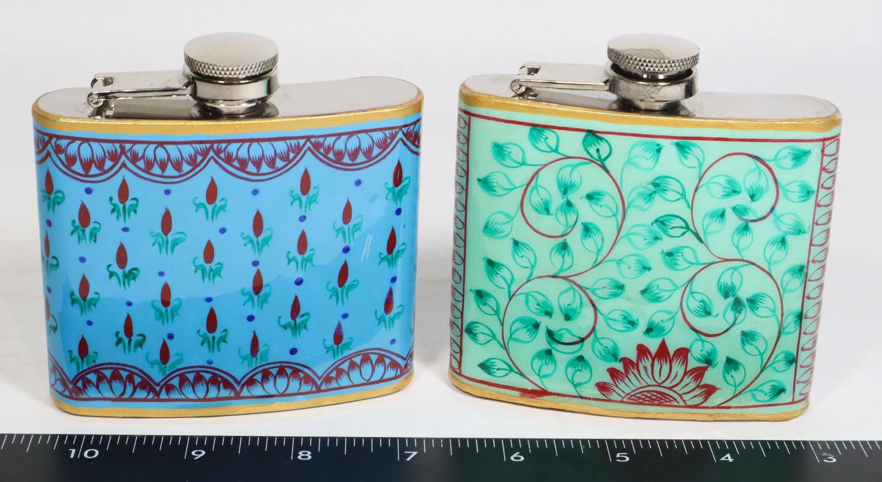 TWO 5-OZ STAINLESS STEEL FLASKS, HIGHLY DECORATED