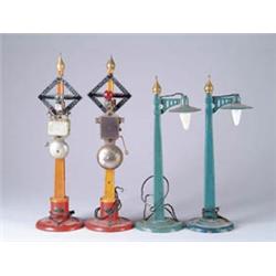 TWO AMERICAN FLYER CROSSING SIGNALS. Includes two lamp posts. CONDITION: Very good to excellent. 1-2983 SC