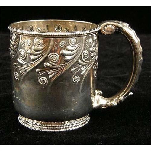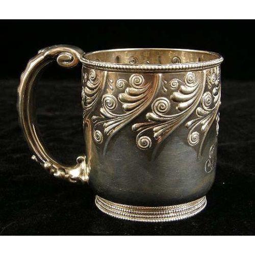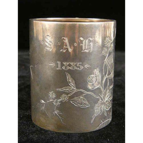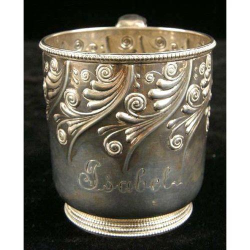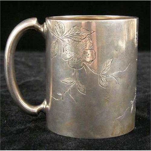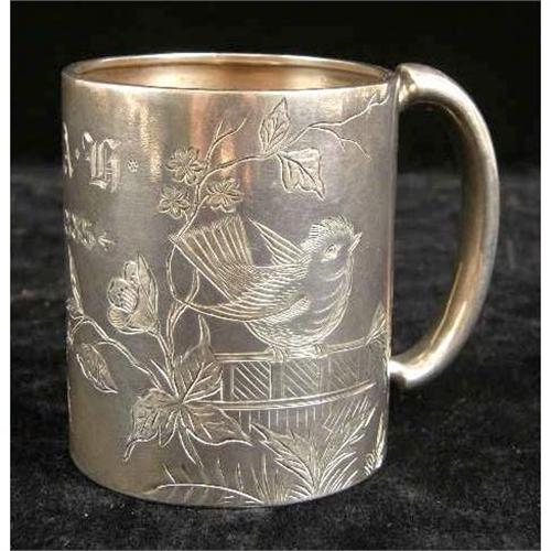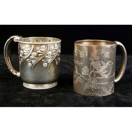 TWO AMERICAN STERLING SILVER HANDLED MUGS<BR><BR>One, monogrammed "S,A.H", and dated 1885, with engraved bird and foliate scene, the other by Gorham, engraved "Isabel", with underside inscription From I.F.J. Aug. 22 `89", beaded borders, scroll motif, each 3-1/4"h, total weight 10 T.O.