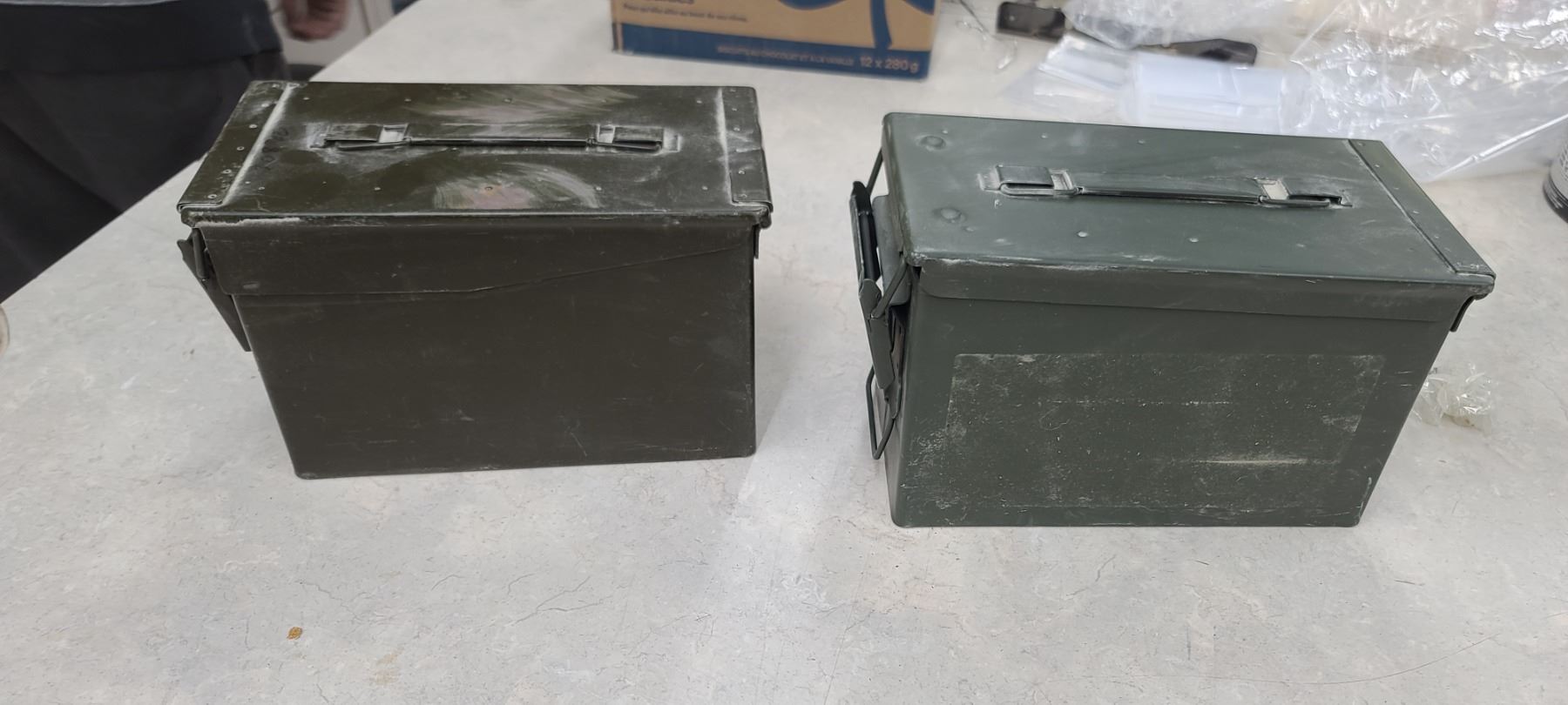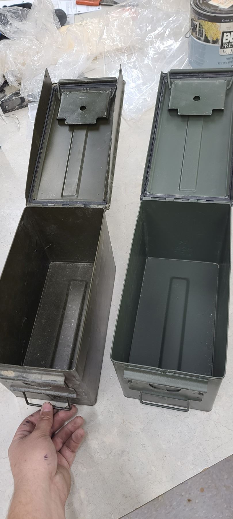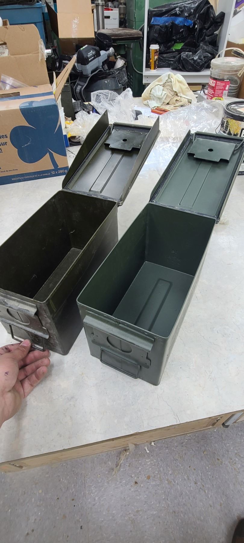 TWO AMMO BOXES - ONE HAS PEG BOARD HOOKS