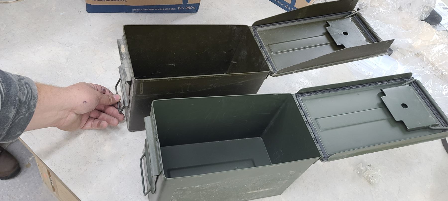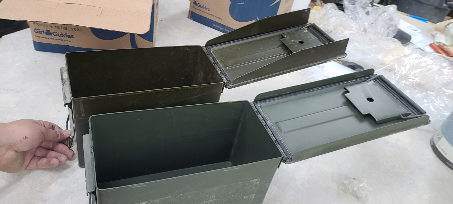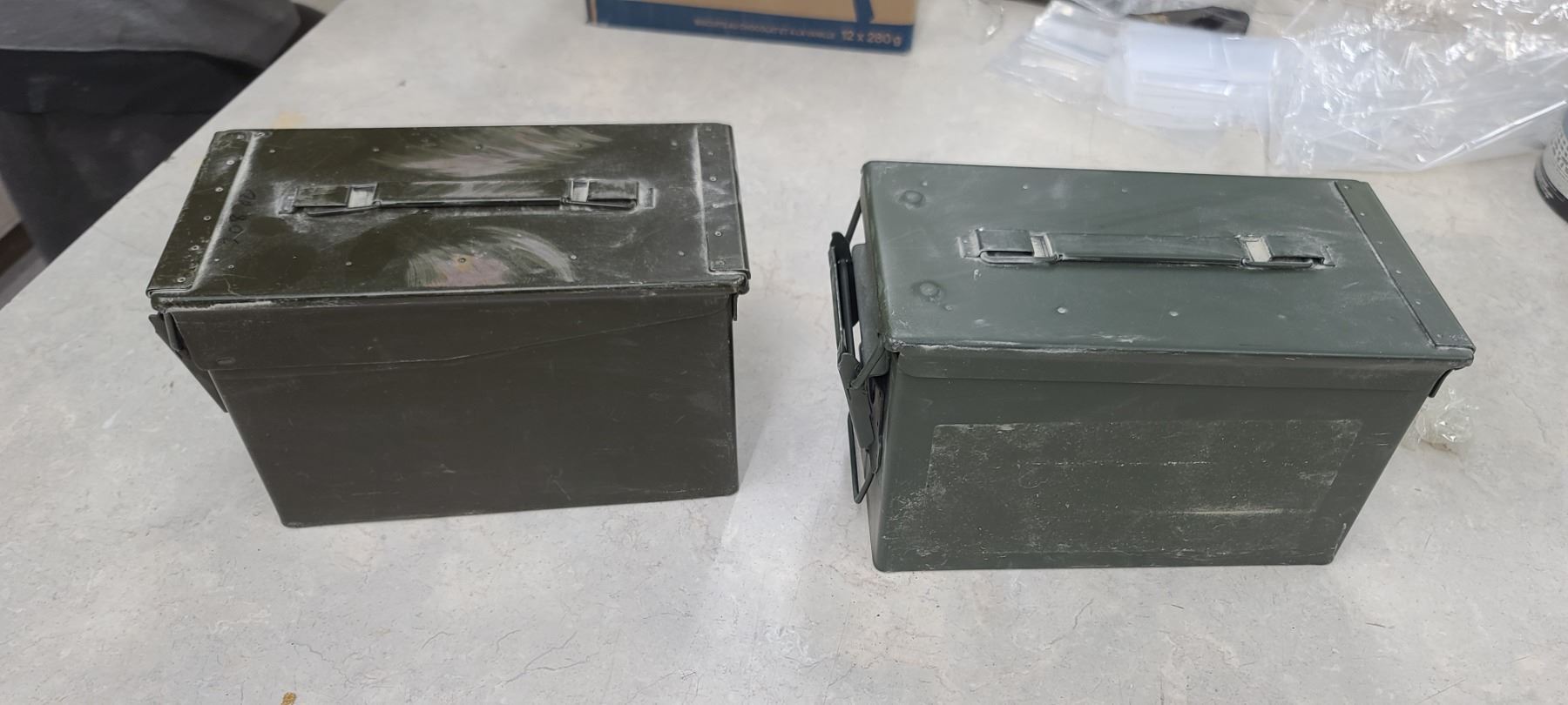 TWO AMMO BOXES - ONE HAS PEG BOARD HOOKS