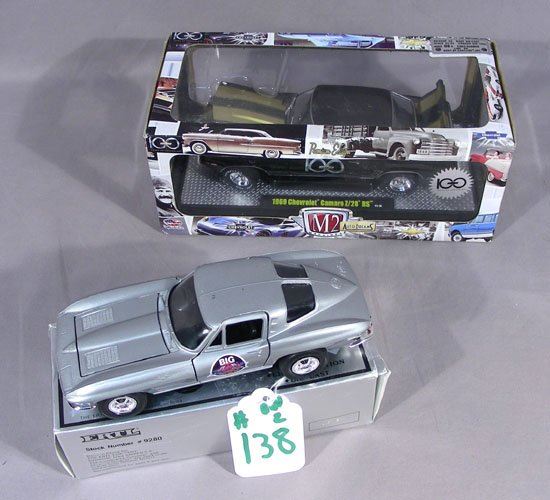 In original boxes. 25th Anniversary 1963 Corvette for Big Auto Parts by Ertl and 100 years of Chevrolet - 1969 Chevy Camero Z28-RS from M2 Machine.