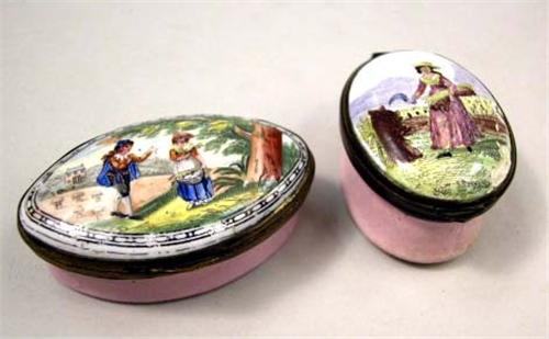 TWO ANTIQUE BATTERSEA OR SOUTH STAFFORDSHIRE POLYCHROME-DECORATED ENAMEL PATCH BOXES; English, each depicting bucolic images opening to mirrored interiors From 1 1/2"h to 1 3/4"h