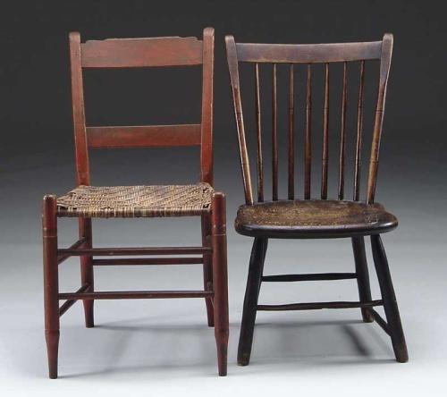 TWO ANTIQUE CHAIRS. 1) Cane seat red ladder-back. SIZE: 33” h x 17-1/2” seat h. CONDITION: Seat as is. 2) Seven spindle back thumb-back Windsor side chair. SIZE: 32-1/2” h x 15” seat h. CONDITION: Shows wear and use. 9-27493