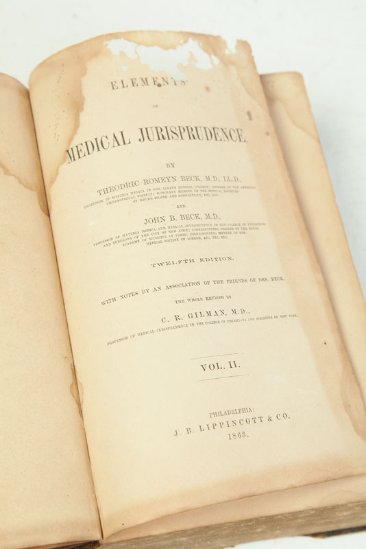 Includes Hollock, A Popular Treatise on Venereal Diseases in All Their Forms..., NY: Excelsior, 1881 (50th edition), 16mo in full cloth, with color plates. Together with Beck and Beck, Elements of Medical Jurisprudence, Philadelphia: Lippincott, 1863, 8vo in full leather.