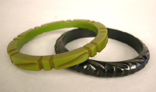 TWO BAKELITE CARVED BRACELETS; One black, the other jade green