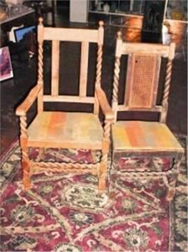 TWO BARLEY TWIST CHAIRS, ONE ARM CHAIR, ONE WITH A CANE BACK, NO ARMS.