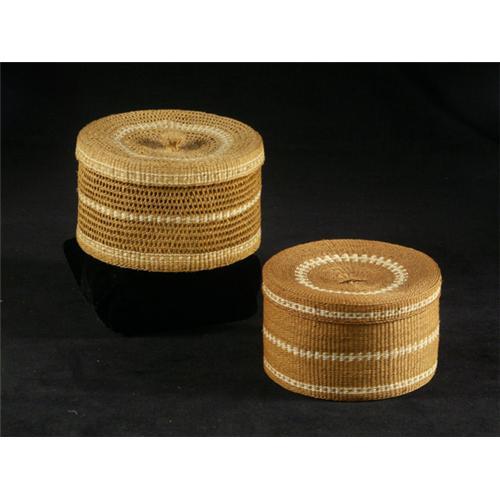 Two lidded finely woven basket boxes, unattributed. The first is reticulated with tonal banding and a woven knob, 3 1/2''H x 5 1/2'' diameter. The second is a tightly twilled basket box with light banding, 3''H x 5'' diameter, exterior fading.